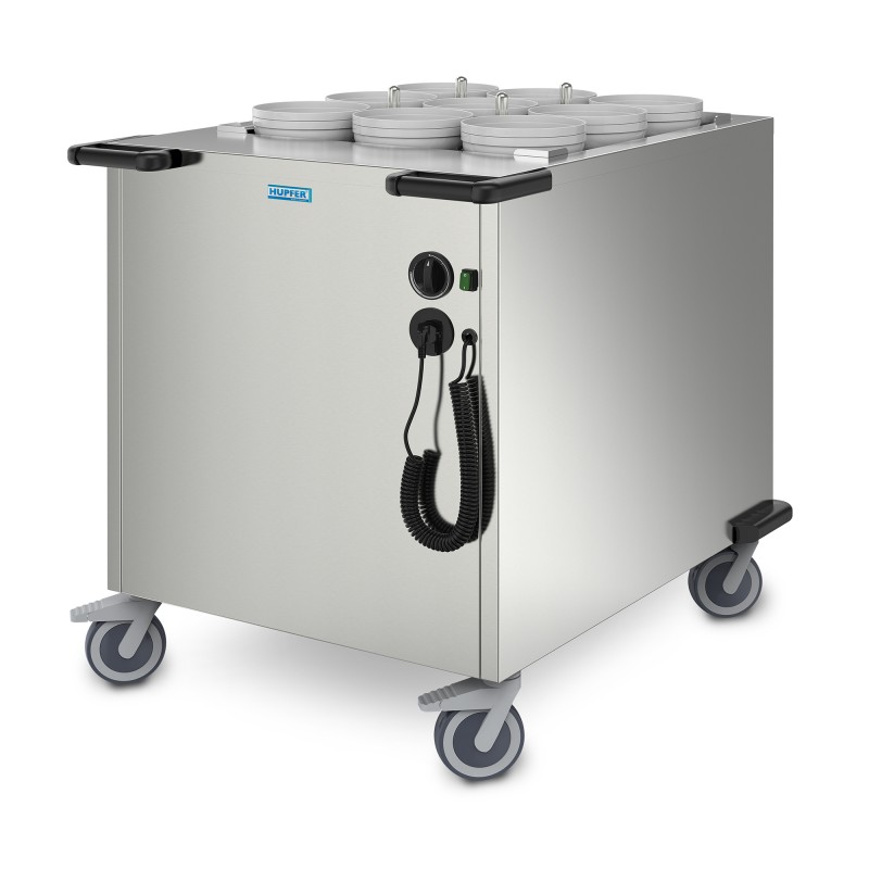 Ventilator verwarmde platformstapelaar vervaardigd uit roestvrijstaal. Twee ergonomisch gevormde duwgrepen. Temperatuurregeling 20 - 110°C, maximale serviestemperatuur 80°C. 4 corrosiebestendige en onderhoudsvrije kunststof zwenkwielen ø125 mm. waarvan 2 met rem. Draagvermogen 200 kg. Inclusief kunststof deksel.