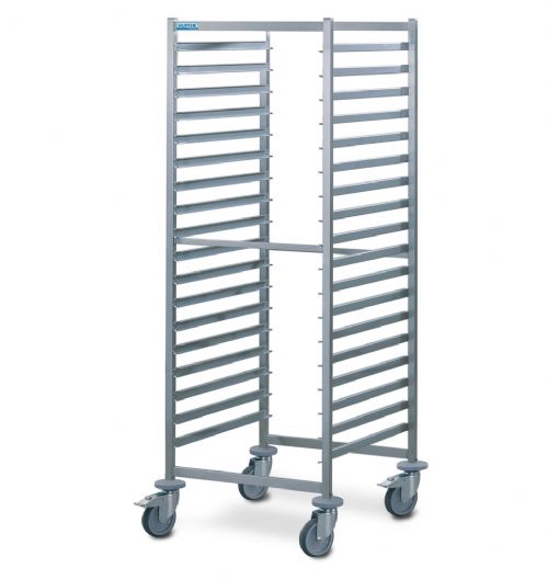 Roestvrijstaal, wagen is opgebouwd uit vierkante buis 25x25 mm. Voorzien van 18-stel opgelaste U-geleiders met doorschuifblokkering aan beide uiteinden en kantelbeveiliging. Verticale afstand tussen de geleiders bedraagt 75 mm. Vier corrosiebestendige, onderhoudsvrije zwenkwielen ø125 mm. waarvan twee met rem. Draagvermogen 180 kg.