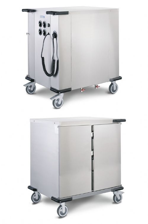 In- en uitwendig roestvrijstaal. Vlak bovenblad met daaronder twee verwarmde vakken 1/1GN elk met 7 paar geleiders hoh 75 mm. Temperatuur per kastvak traploos instelbaar van 30 - 80°C. Als de kast niet wordt verwamd en er een koelpallet in de bovenste geleider wordt geschoven, kan deze ook worden gebruikt voor gekoelde opslag.