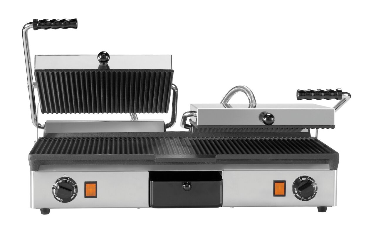 Geheel roestvrijstalen buitenmantel, gietijzeren platen met speciale keramische versmolten coating, schoon te houden met staalborstel. Temparatuur instelbaar tot 300°C. Gebalanceerde, in hoogte en druk verstelbare bovenplaat. Inclusief vetopvanglade en staalborstel.
